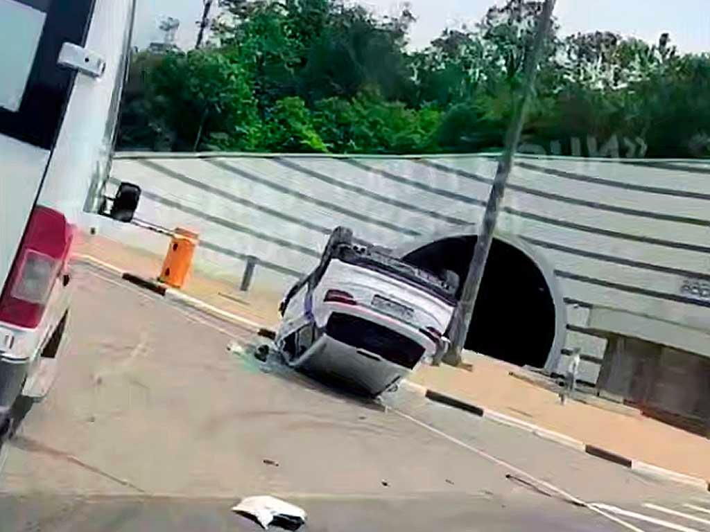 Автомобиль лежит на крыше на пяточке перед въездом в тоннель, что привело к образованию пробки. Пока неизвестно, что стало причиной происшествия.